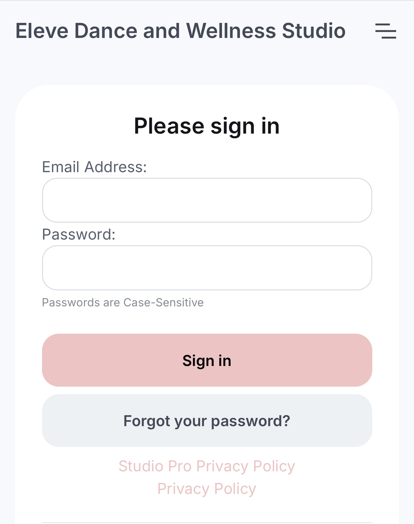 Once you downloaded the app, log in with the email you used to register & click on Elevé Dance & Wellness Studio